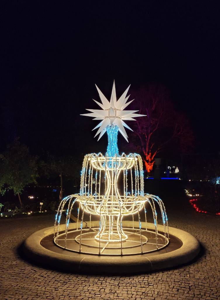 Als die Dämmerung einsetzt, fahren wir zur Insel Mainau. Im Sommer ein Ort voller Blumen, im Winter ein Ort voller Licht. Der Christmas Garden ist kein lauter Weihnachtsmarkt, sondern ein stiller, kunstvoll gestalteter Pfad. Wir betreten die Welt der Installationen und fühlen uns, als würden wir in ein modernes Märchen eintreten.