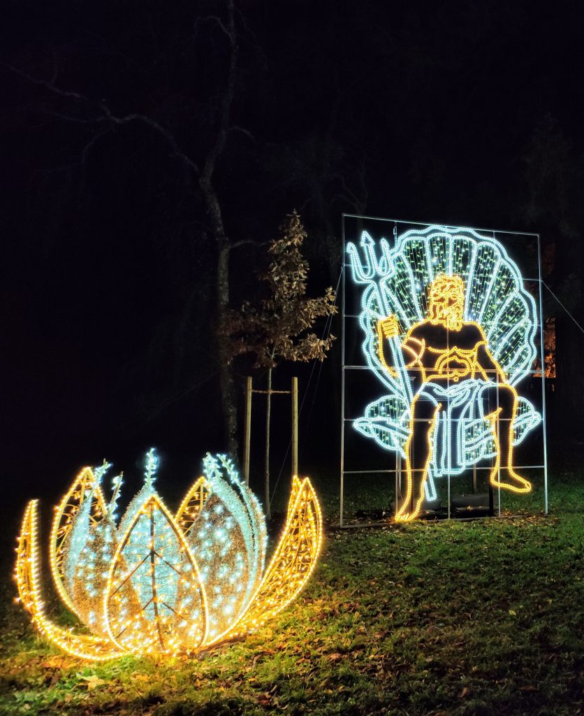 Wir wandern fast ehrfürchtig durch diese Atmosphäre. Immer wieder bleiben wir stehen, staunen, fotografieren. Lichtinstallationen, die wie Wellen auf dem Wasser wirken, Sträucher wie von innen heraus illuminiert, Kunstobjekte zwischen alten Baumriesen.